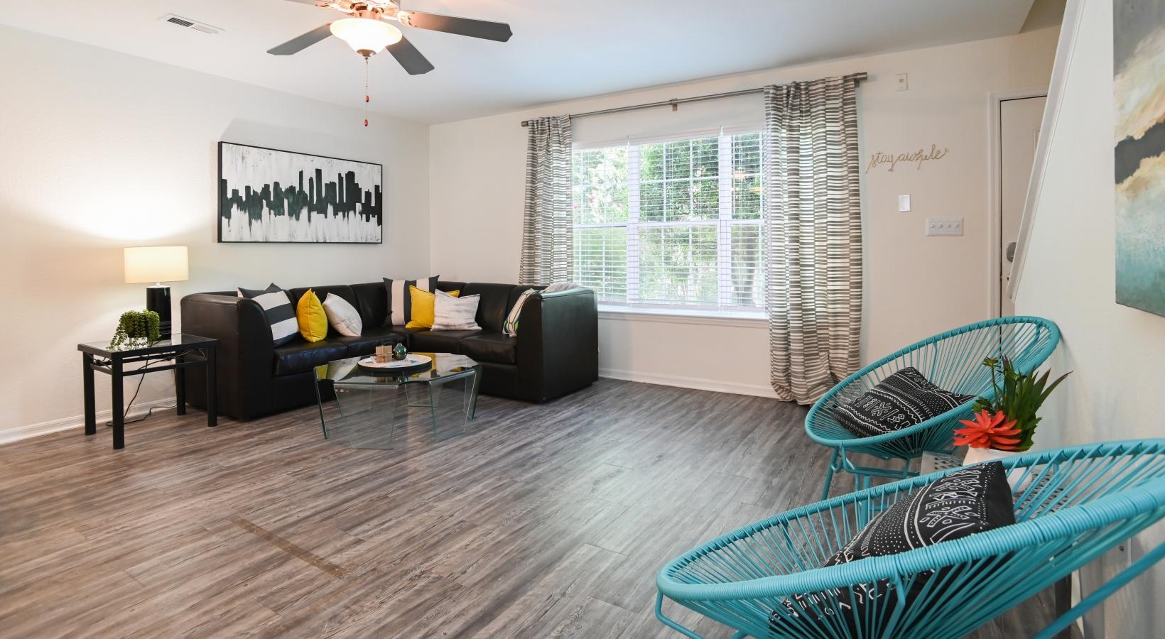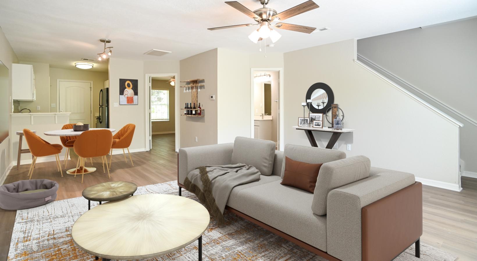 • a living room with a couch and a fan
