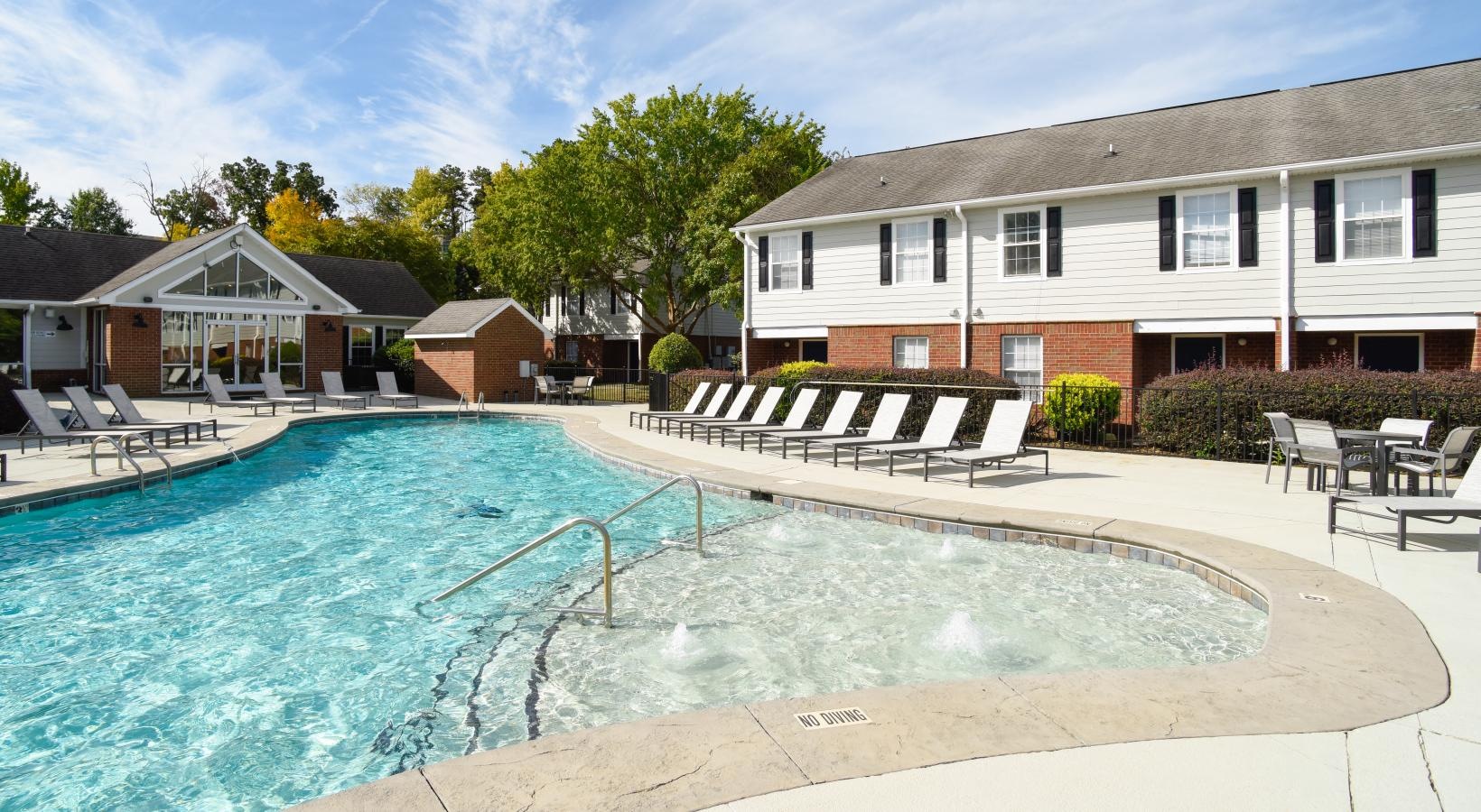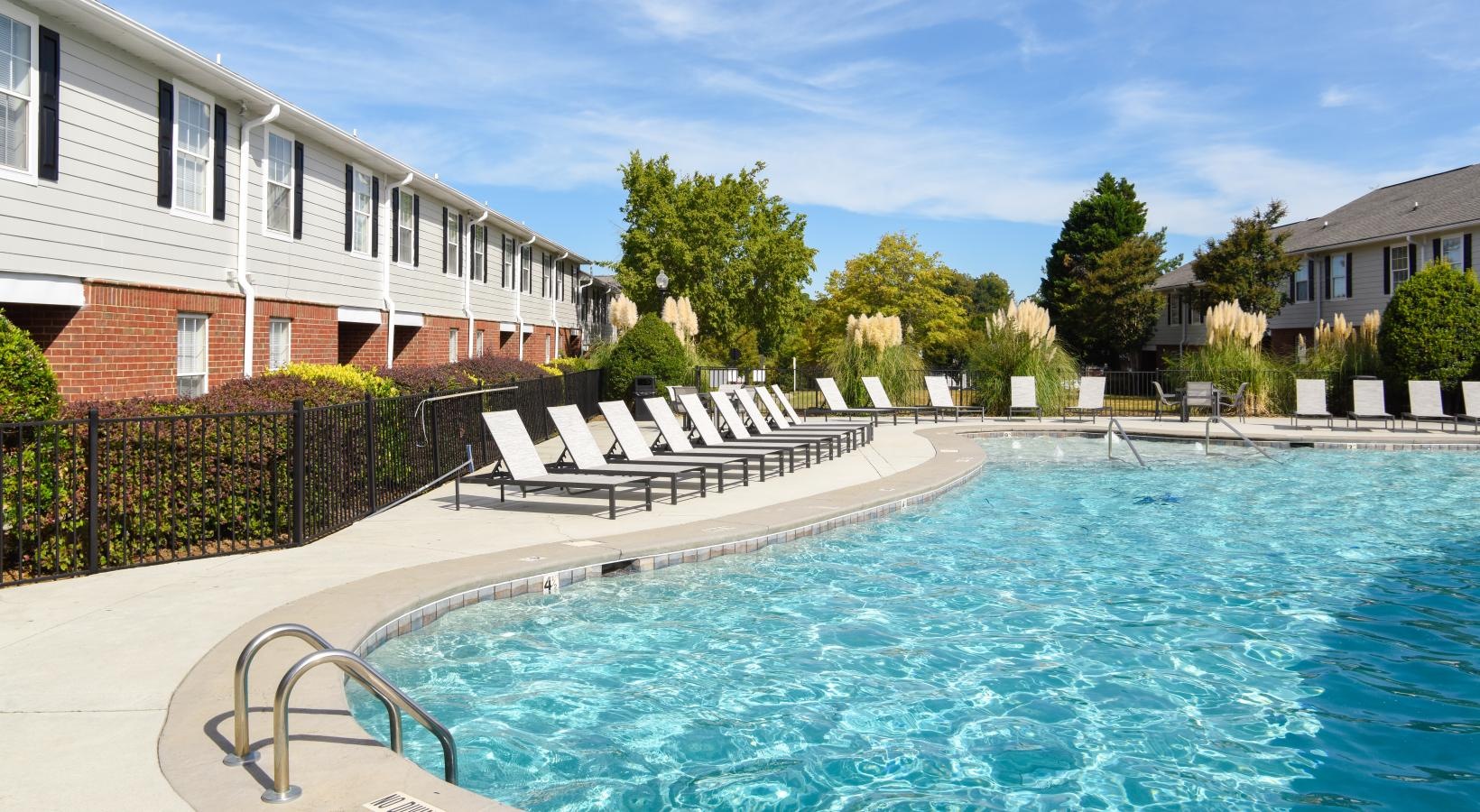 • a swimming pool with chairs and a building in the background