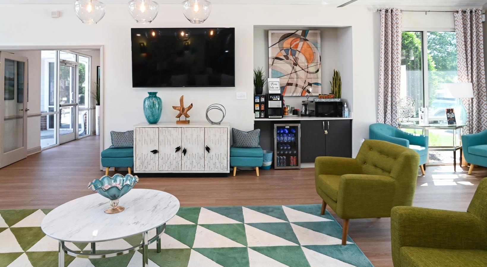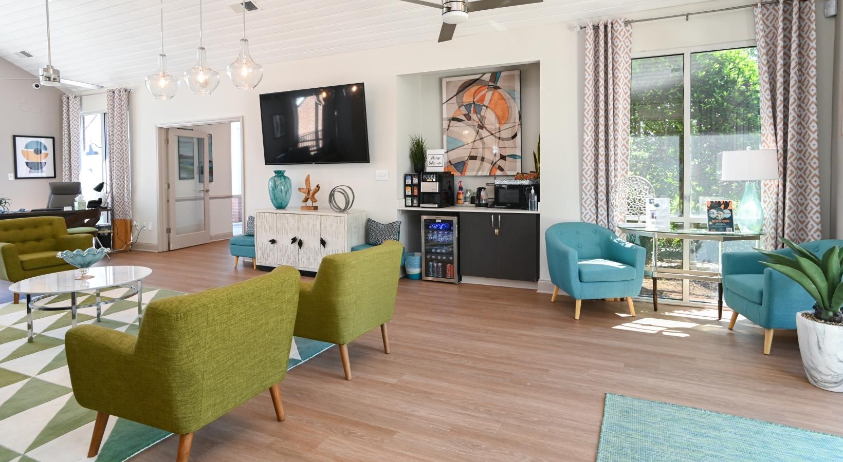 • a club room with green chairs and a tv