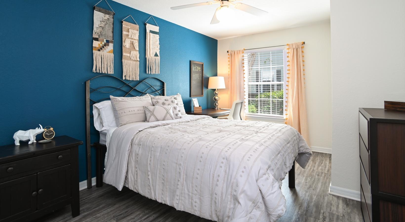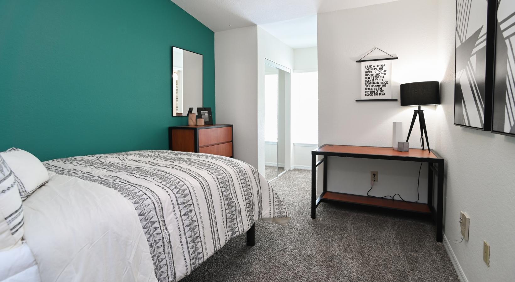 • a bedroom with teal blue accent wall and a desk for studying