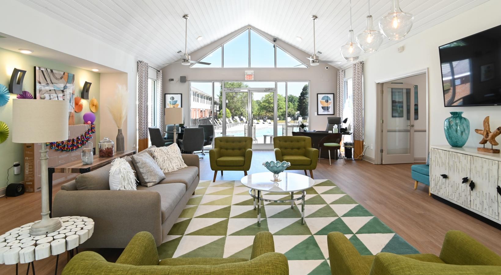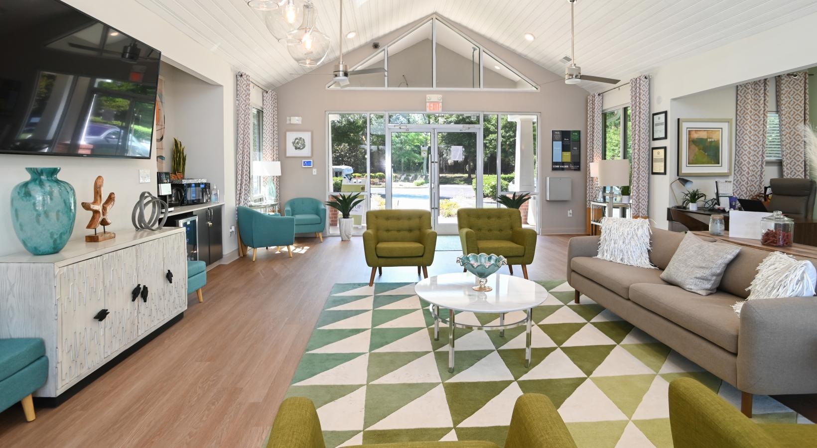 • a living room with green chairs