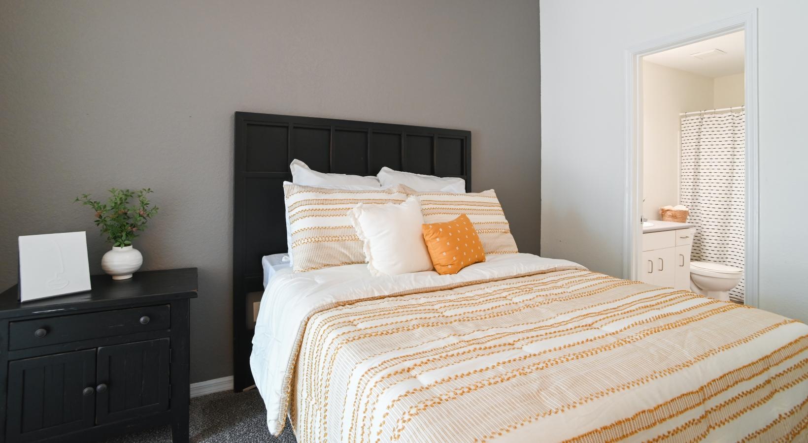 • a bed with orange pillows