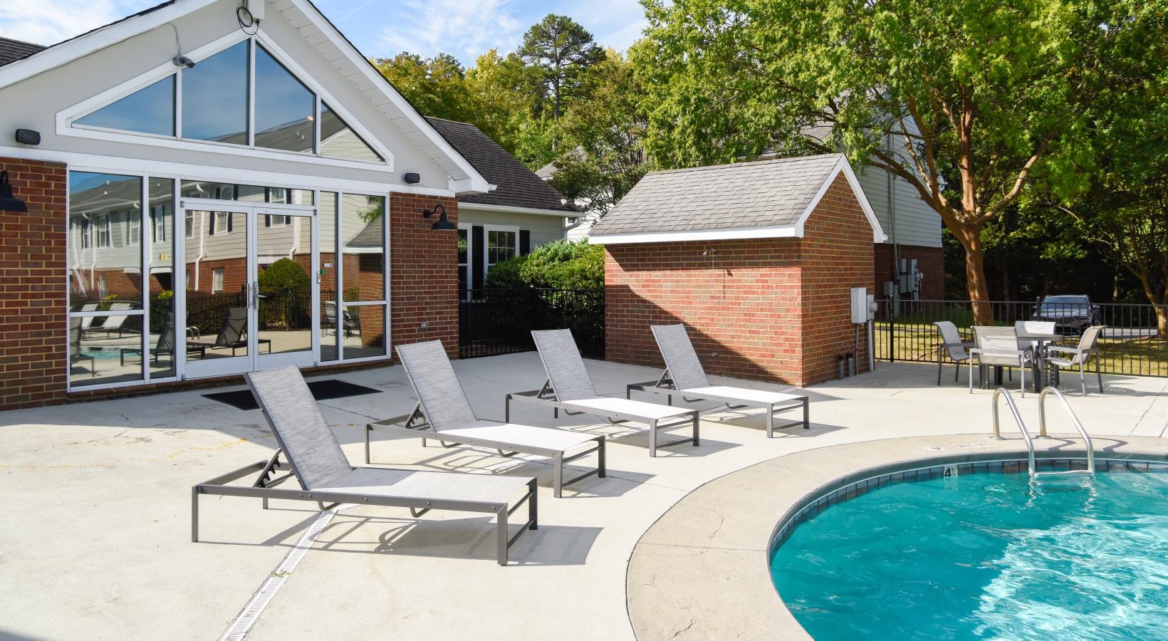 • a swimming pool with chairs around it