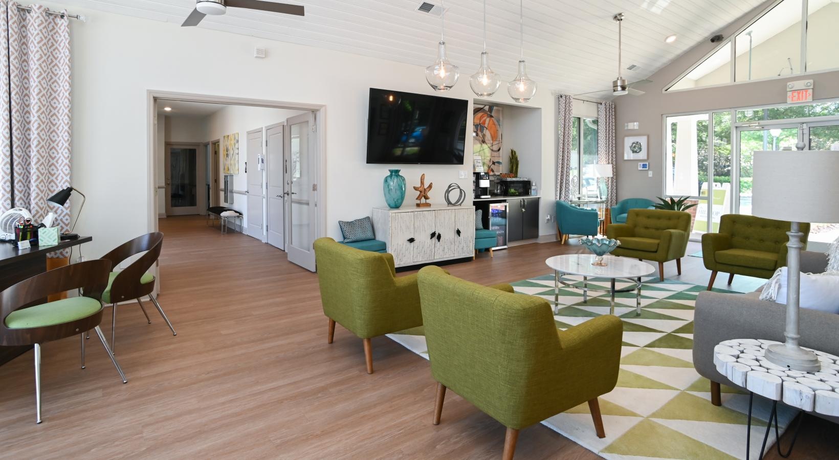 • a club room with green chairs
