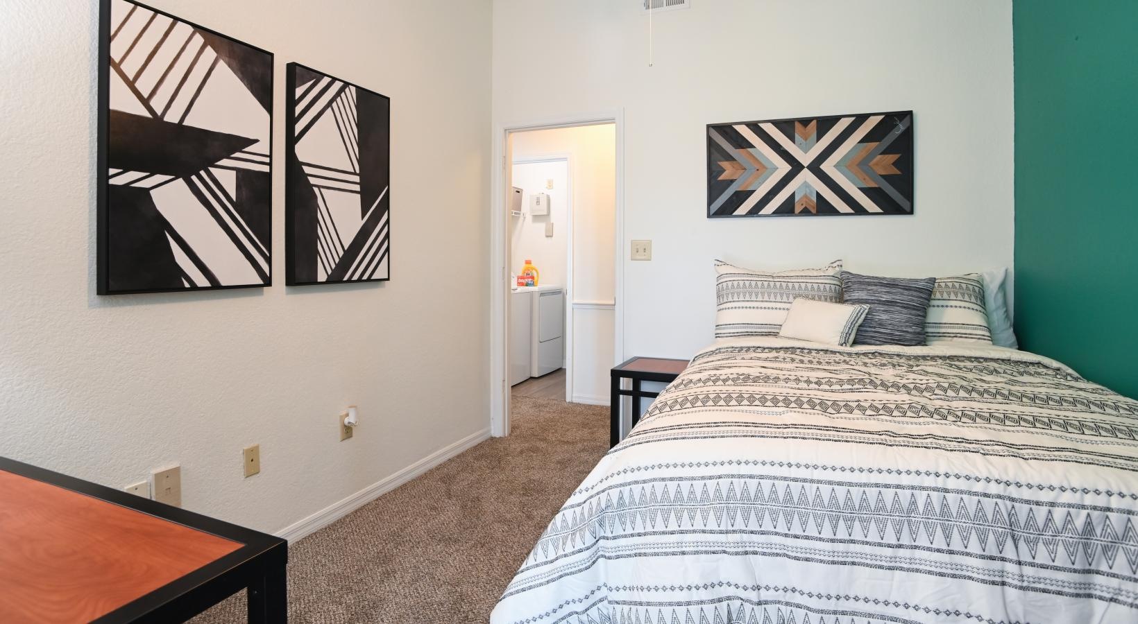 • bedroom with full bed, desk for studying, and black and white geometric paintings on the wall