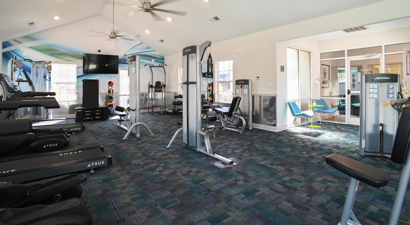 • a room with exercise equipment and chairs