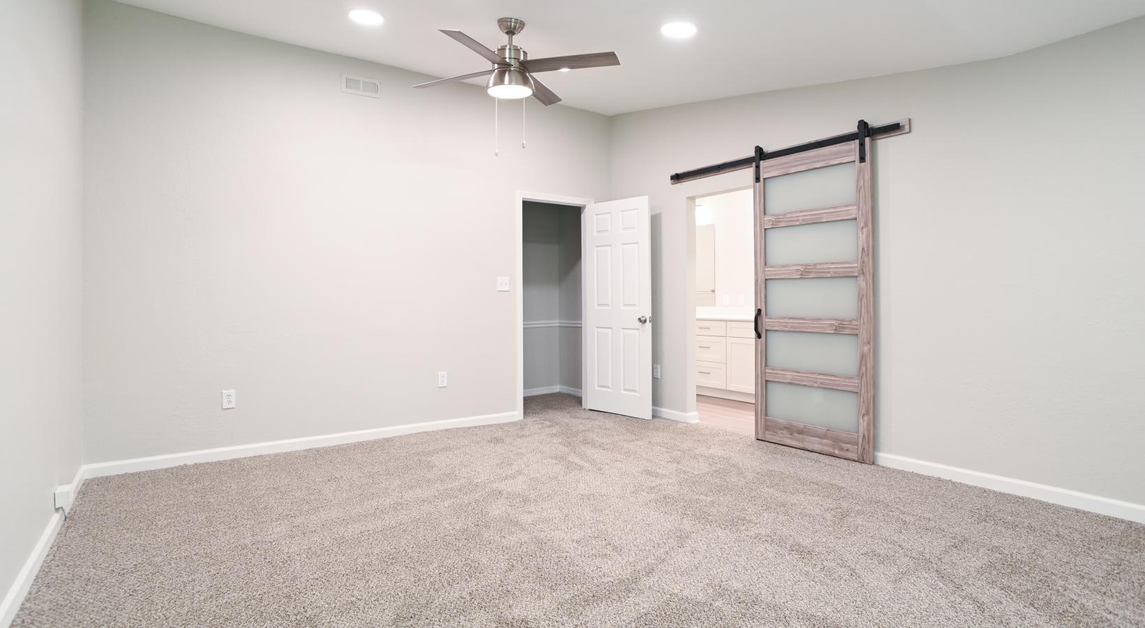 • a room with a ceiling fan and a door