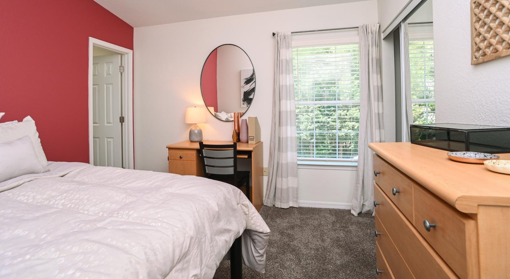• a bedroom with queen bed, red accent wall and desk with large mirror